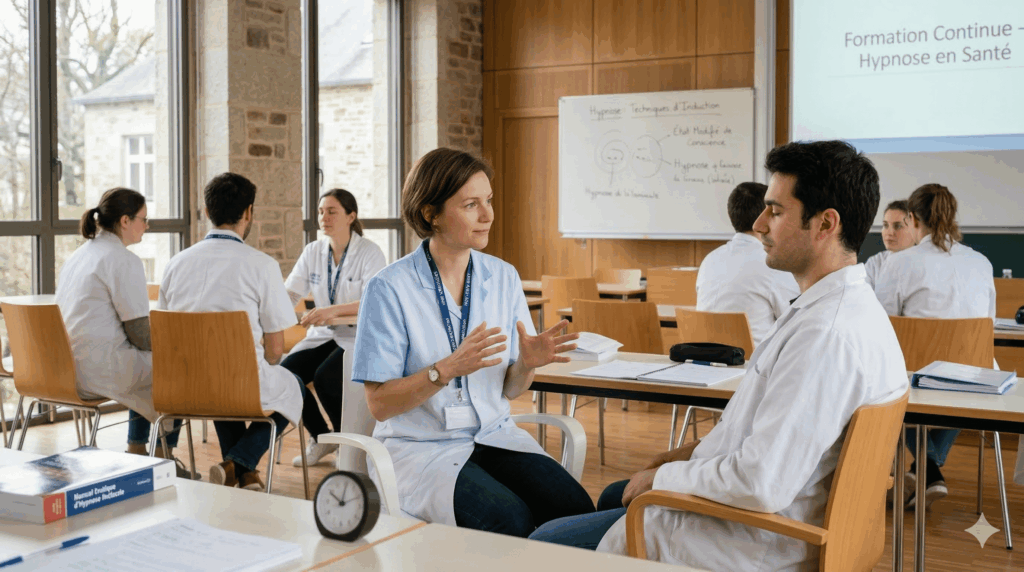 À noter : l’hypnose médicale n’est pas une spécialité médicale reconnue au sens réglementaire. Elle constitue une compétence complémentaire que les professionnels de santé intègrent à leur exercice. C’est pourquoi le choix d’une formation de qualité, encadrée par des praticiens expérimentés, reste essentiel.